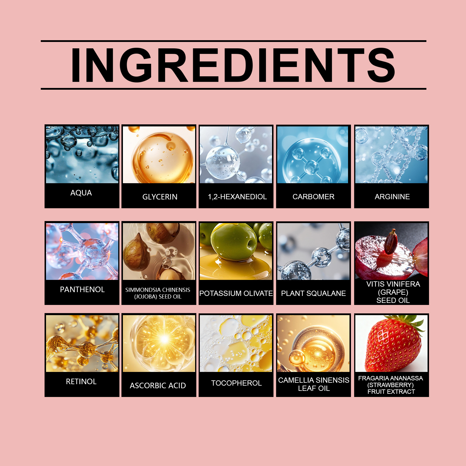 Product information: Ingredients: water glycerin 1,2- hexanediol carbomer arginine panthenol jojoba seed oil olive oil squalane grape seed oil retinol ascorbic acid (vitamin C) tocopherol (vitamin E) tea oil strawberry fruit extract.